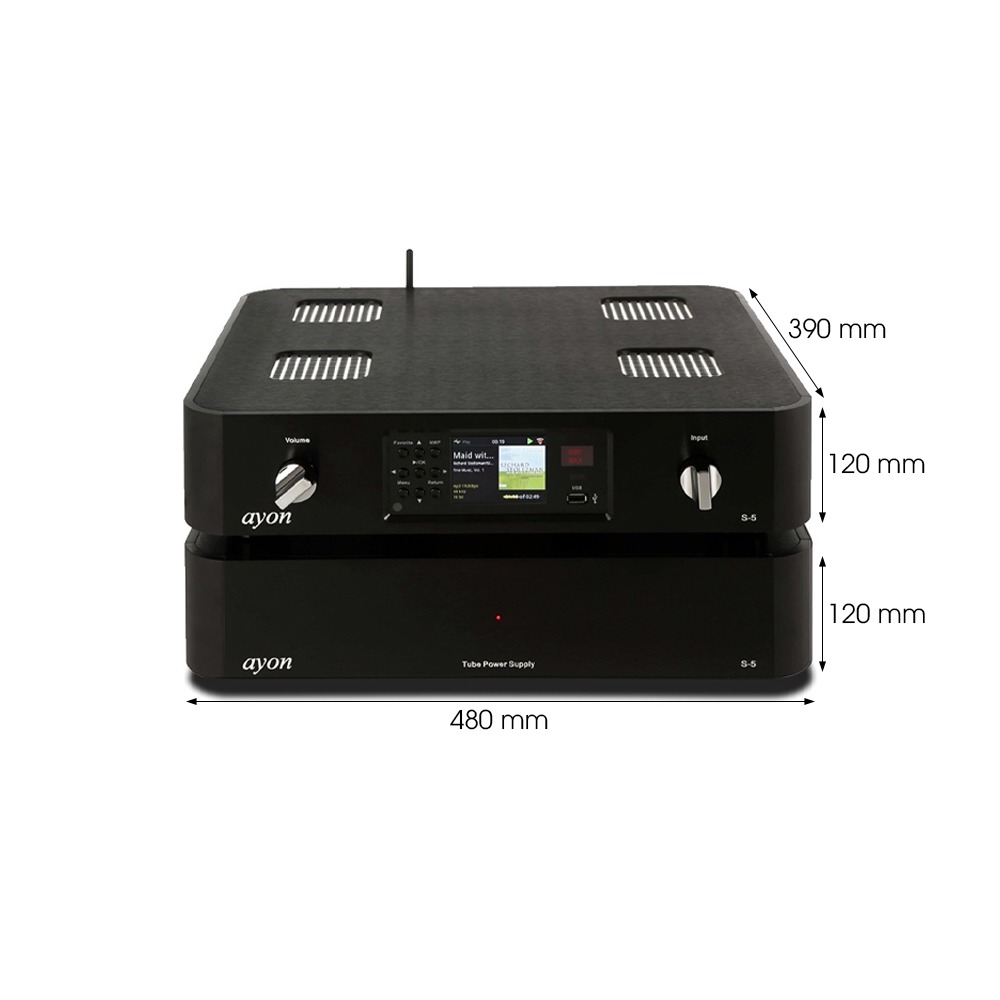 Network Streamer Ayon S-5 XS là một thiết bị audio cao cấp, chính là sự tách biệt hoàn toàn giữa phần mạch chính và mạch cấp nguồn Tube Power Supply thành 2 khung máy riêng, mang những đặc trưng thiết kế của Ayon. Cả hai khung máy này đều có chung kích thước là 120 x 480 x 390mm, với trọng lượng của khung máy chính là 12 và phần cấp nguồn là 14.5kg, dễ dàng thiết đặt máy ở mọi vị trí trong không gian nghe.